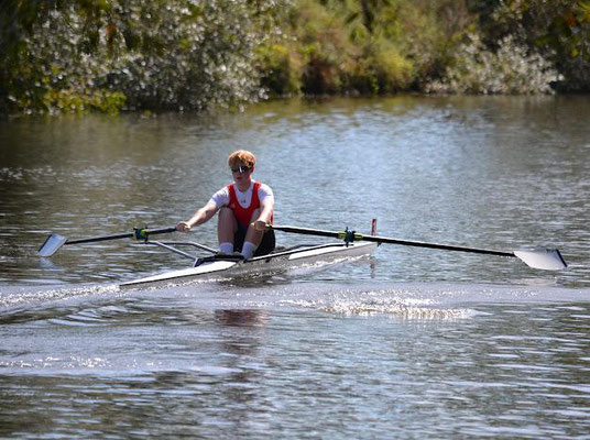 Danach startete Justus im Einer. Nach einem kleinen Abstecher Richtung Uferkante kam er als Letzter ins Ziel.