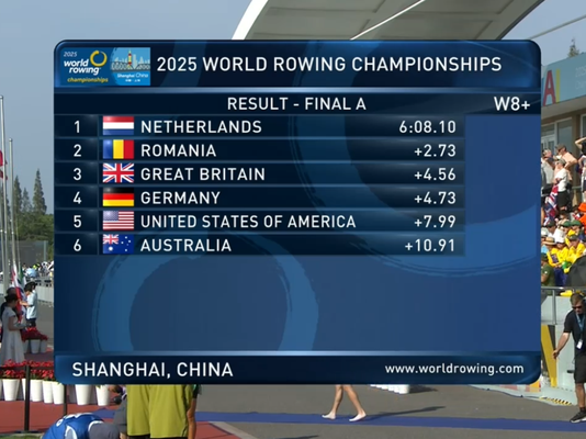 Nach einem zweiten Platz im Vorlauf fuhr der deutsche Frauenachter mit Luise (Platz 5) ein starkes Finale. Über rund drei Viertel der Strecke lag das Boot an dritter Position, zum Schluss holten die Britinnen auf und lagen im Ziel um eine Bugballlänge vorne (zwei Zehntelsekunden) .