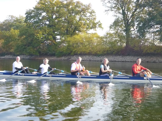Etwa 30 Ruderer und Nichtmehrruderer standen bereit, Wolfgang sprach ein paar freundliche Worte, ein strenger Blick von Heiner genügte, um ihn noch an ein dreifach gebrülltes hipp-hipp-Hurra zu erinnern, und dann konnte Stefan W sich schon in seiner Lieblingsaufgabe regelrecht austoben, dem Einteilen der Boote! Fünf Boote gingen schließlich aufs Wasser, am Steg musste filigran eingefädelt werden, denn die große Fähre Michael liegt wegen des Niedrigwassers im Hafen vertäut und neben dem Steg ist es nun eng. Wie fast immer war das Ziel die Königsklinger Aue, die sonst gerne nervenden Sportbootfahrer verschonten uns weitgehend, und wenn eine Strecke mit genug Wasser unterm Kiel gefunden wurde, war es bei sehr wenig Wind eine wunderbare Tour.