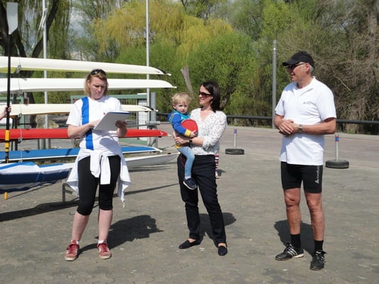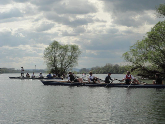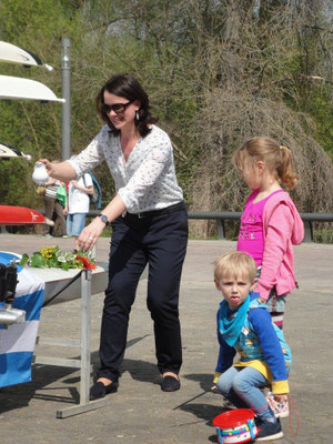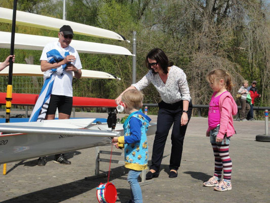 Der blumengeschmückte Einer wurde auf den Namen "Schwan" getauft, dazu kam eigens unsere Bürgermeisterin Evelyne Breyer mit ihrem Nachwuchs und fand nach der Taufe noch lobende und freundliche Worte für dies und das. Zwei weitere Neuanschaffungen waren leider auf Regatta, so dass der offizielle Teil zügig erledigt war. Frau Breyer wollte auch in diesem Jahr nicht mit ins Boot, aber Rolf übernahm die Betreuung an Land und am Steg, und ich glaube, anschließend und außer Konkurrenz auch an der Kuchentheke, denn wir anderen waren damit beschäftigt, tatsächlich sechs Großboote zu Wasser zu lassen.