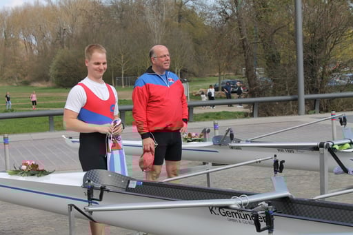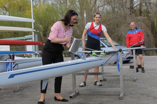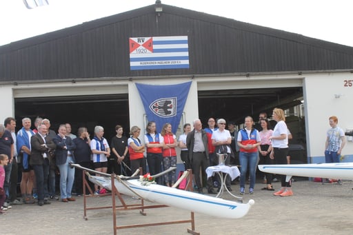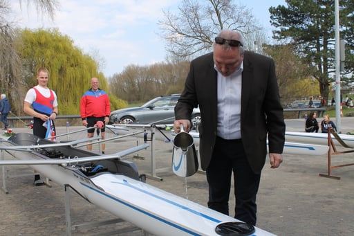 Der Platz vor dem Bootshaus war schön hergerichtet, die Bootstäuflinge lagen in Reih und Glied, Fahnen wurden gehisst und nach und nach füllte sich der Platz mit Ruderern und Nichtruderern. Zur Bootstaufe dreier Rennboote kam wieder gut gelaunt Frau Breyer als für den Sport zuständige Bürgermeisterin, erstmals erschien auch unser Oberbürgermeister Herr Claus sowie als Sponsor unser Vereinskamerad Tim Gemünden. Sie alle nahmen gewissenhaft die Taufen vor, auf dass nun allen Booten stets eine Handbreit Wasser unter dem Kiel und im Idealfall noch der eine oder andere Sieg gewiss sein möge.