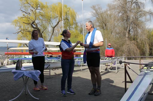 Antje gab als Vorsitzende ein gelungenes Debüt mit einer kleinen Ansprache, Andreas Beer bekam die Urkunde zum Trainer des Jahres der Stadt Ingelheim von ihr überreicht, die ihm vergangene Woche in Abwesenheit verliehen wurde. Anschließend ehrte Antje besonders ihren Mann Andreas zum sage und schreibe 30. Fahrtenabzeichen, dazu noch Dörte und Dorothee zum 5. und 10. Abzeichen jeweils mit einer Ehrennadel und Philipp konnte diese kleine Auszeichnung auch zum dritten Mal errudern. Schließlich folgte Heiner noch seiner Mission und sorgte für ein kraftvolles hipp-hipp-Hurra.