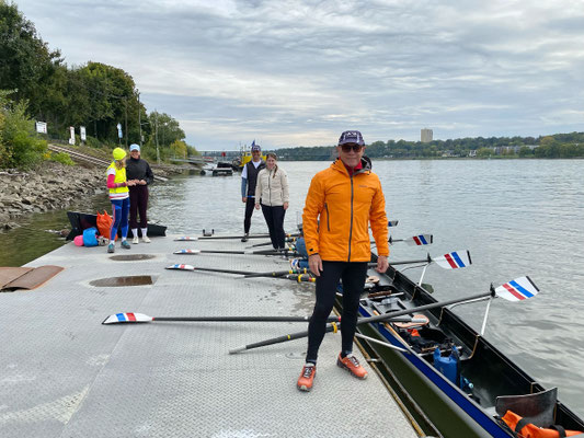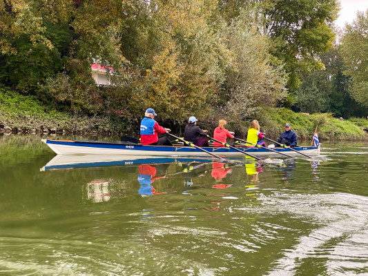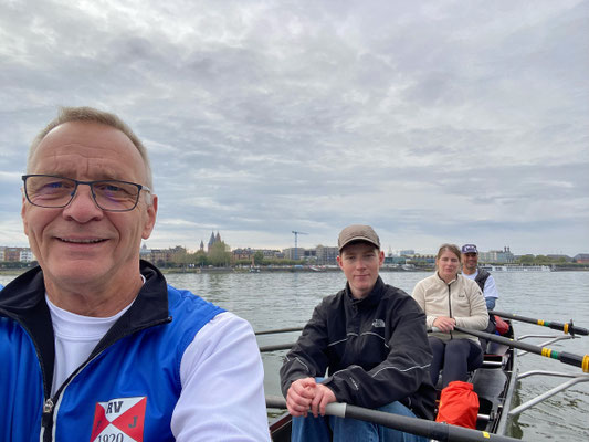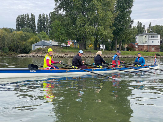 Wieder eine sehr gute Wahl von Robert und wie gewohnt prima vorbereitet. Mit unseren beiden Schlachtschiffen Carolus Magnus und Rheingau auf dem Hänger fuhr uns Frank wohlbehalten bis ans Rheinufer vor. Acht vom Dauerregen der Woche nicht abzuschreckende Ruderinnen und Ruderer stachen gegen 10 Uhr bei strahlendem Sonnenschein in See. Auch der Rhein zeigte sich an diesem Vormittag als leicht zu bändigender Drachen.